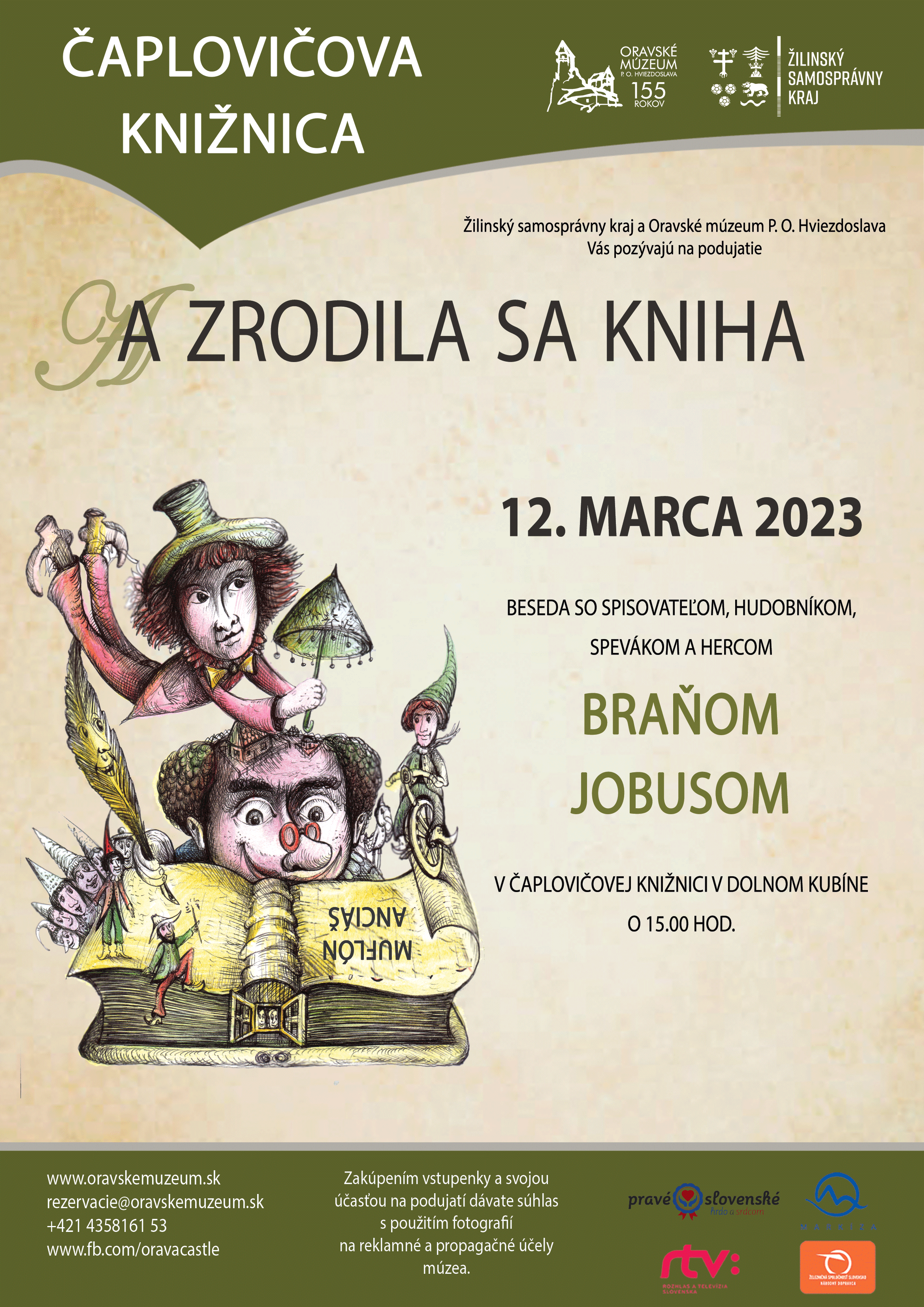 Dolný Kubín, nedeľa, 12. marec. 2023 – Oravské múzeum P. O. Hviezdoslava, ktorého zriaďovateľom je Žilinský samosprávny kraj, pripravilo podujatie s názvom „A zrodila sa kniha“. Pozvaným hosťom bol Braňo Jobus, známy spisovateľ, herec, hudobník a spevák. Všetky svoje talenty predviedol v nedeľu 12. 03. 2023 o 15: 00 v priestoroch expozície P. O. Hviezdoslava, Čaplovičovej knižnice v Dolnom Kubíne. Súčasťou besedy bolo autorské čítanie, hudobné vstupy a výstava kníh samotného autora. Záujem o tvorbu Braňa Jobusa prejavili všetky vekové kategórie.