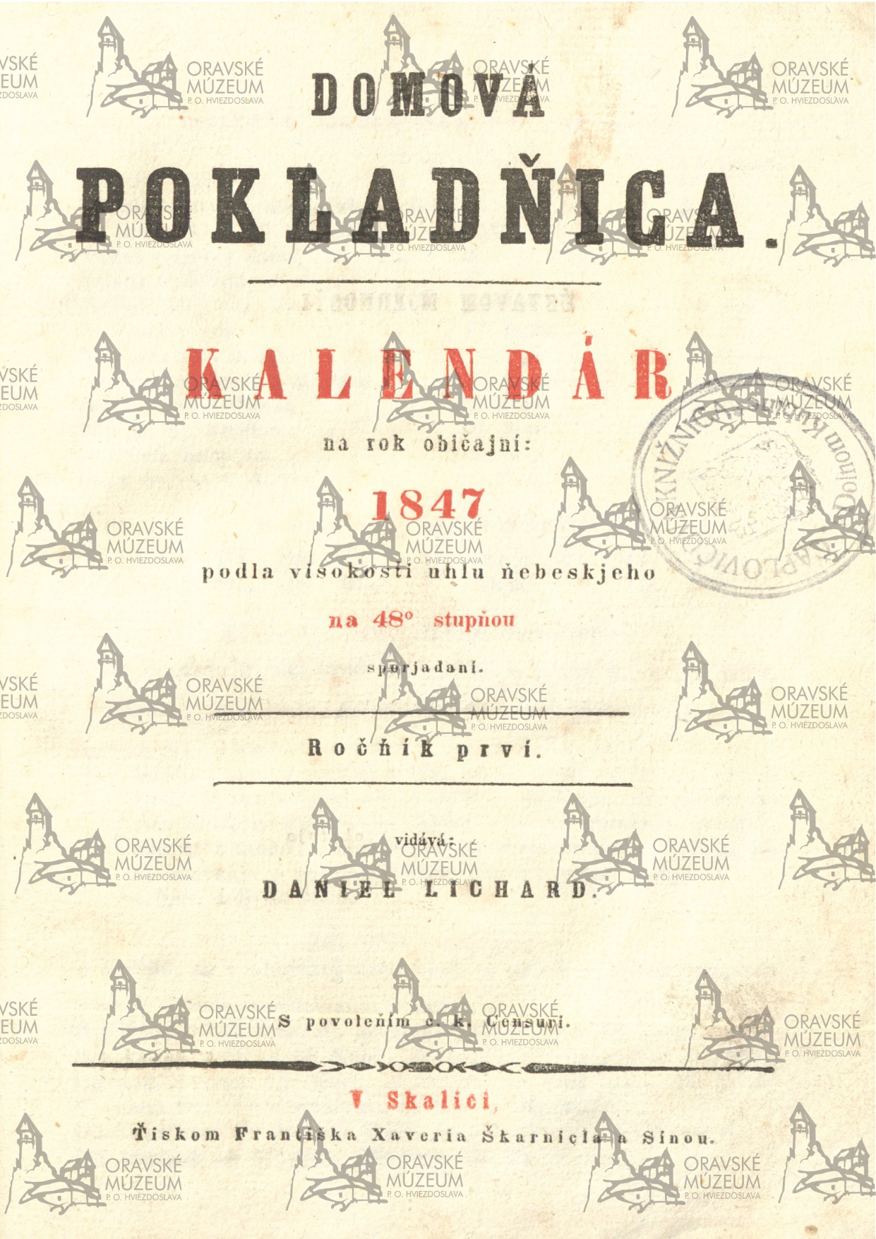 - Domová pokladnica. Národný slovenský obrázkový kalendár na prestupný, 366 dní majúci rok Pána 1864. ... Vydáva Daniel Lichard, ... V uhor. Skalici.
