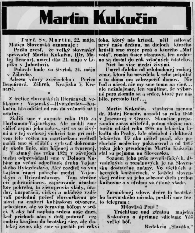 V nedeľu 21. mája 2023 sme si pripomenuli 95. výročie smrti učiteľa, lekára, prozaika a dramatika Martina Kukučína (vlastným menom Mateja Bencúra). Majster slovenského slova skonal vo veku 68 rokov v nemocnici v chorvátskom meste Pakrac. Potom čo Národné noviny 23. mája 1928 ako prvé uverejnili správu o smrti nášho veľkého spisovateľa, sa na Slovensku s článkami venovanými osobe Martina Kukučína doslova „roztrhlo vrece“. Pozornému čitateľovi však nemôže uniknúť, že dobové informácie o okolnostiach a príčinách Kukučínovho skonu sa miestami značne rozchádzajú. Na rovnaký problém narazíme i pri listovaní v spomienkach jeho najbližších. Všeobecná zhoda nepanuje ani ohľadom príčiny spisovateľovej smrti, ani ohľadom toho kedy a kde vlastne ochorel. Ale začnime pekne od začiatku.