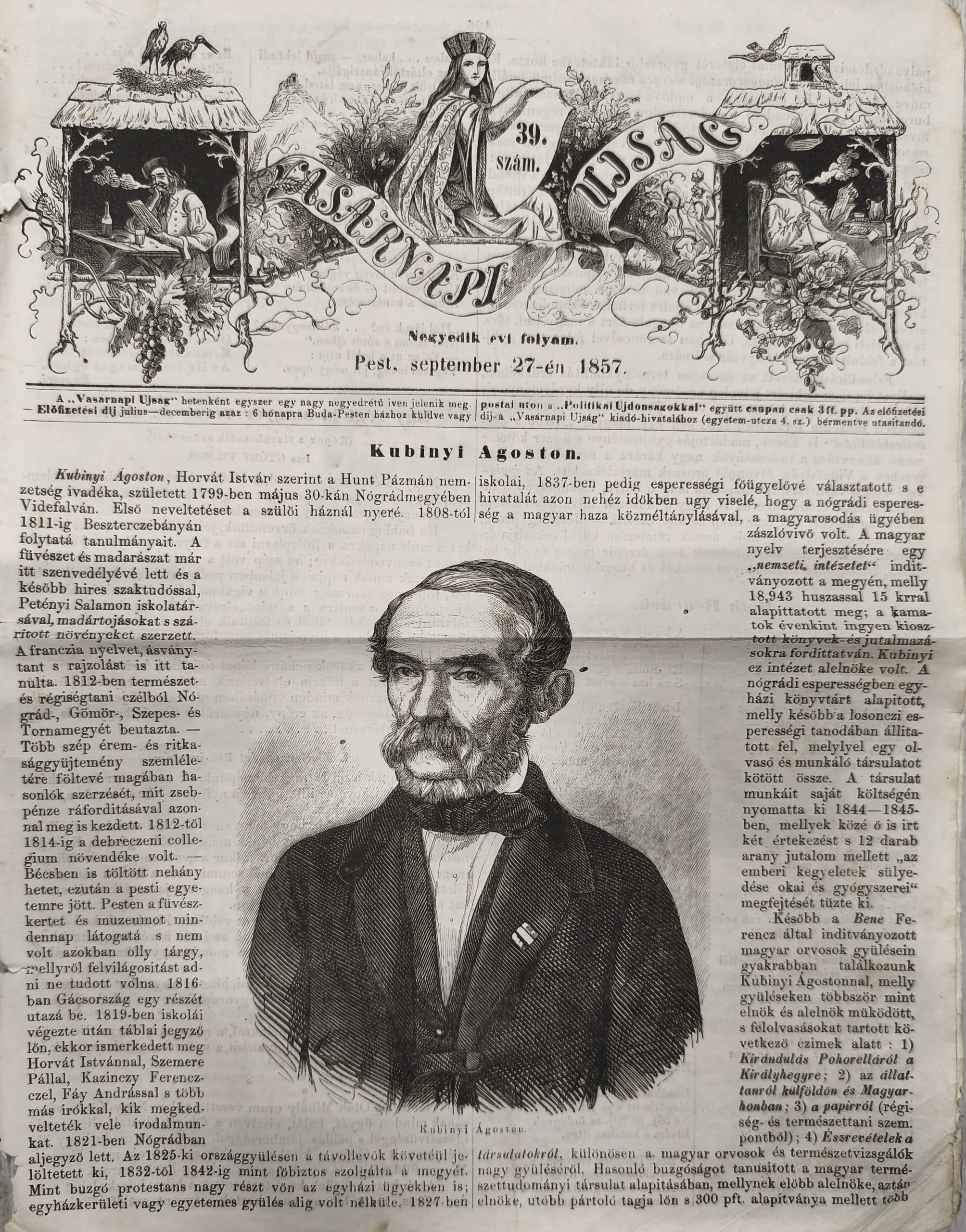Obr. č. 1: Úvodná strana novín Vasárnapi Ujság z 27. 9. 1857. Zdroj: Zbierkový fond Oravského múzea P. O. Hviezdoslava, H-10280