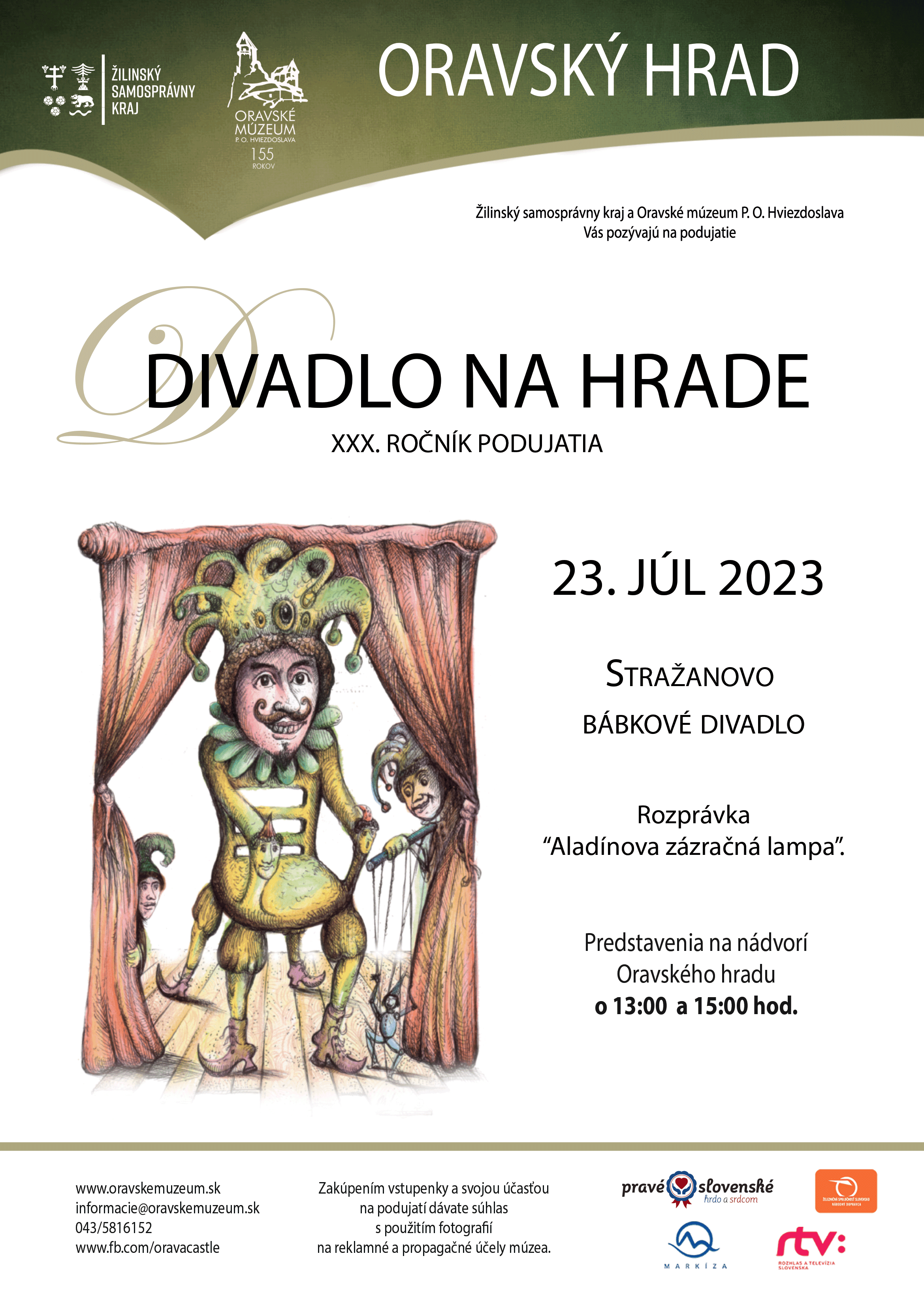 Pri príležitosti XXX. ročníka Divadla na hrade pripravilo Oravské múzeum P. O. Hviezdoslava divadelné popoludnie pre najmenších divákov, ktoré spestrí nedeľné chvíle strávené na hrade. Predstaví sa Vám Stražanovo bábkové divadlo s rozprávkou „Aladínova zázračná lampa“, ktoré patrí svojím repertoárom i formami vystupovania k výnimočným typom slovenských bábkohercov. V roku 2016 bolo bábkarstvo zapísané do zoznamu nehmotného kultúrneho dedičstva ľudstva UNESCO, kde Ladislav  Stražan a jeho predkovia tvoria neodmysliteľnú súčasť kultúrnej tradície a národného kultúrneho dedičstva.