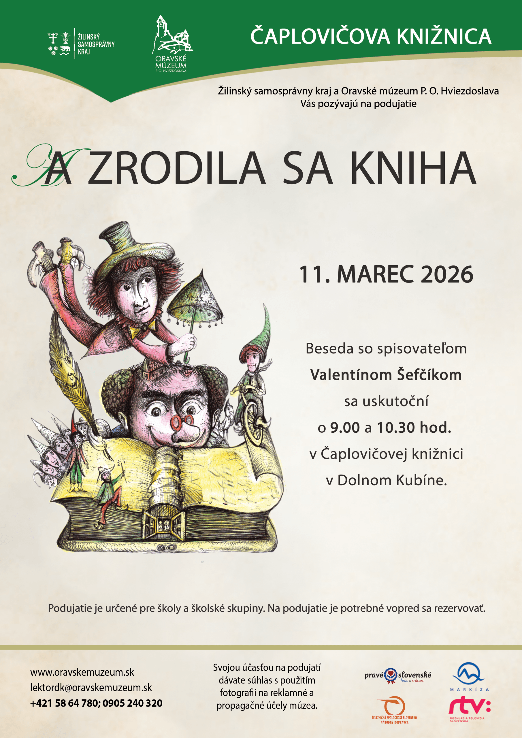 Oravské múzeum P. O. Hviezdoslava pripravilo na stredu 11. marca 2026 v priestoroch Čaplovičovej knižnice v Dolnom Kubíne pre žiakov I. stupňa základných škôl podujatie s názvom „A zrodila sa kniha“. Žiaci sa môžu tešiť na besedu s autorom kníh pre deti a mládež Valentínom Šefčíkom. Súčasťou podujatia bude aj mini výstava „Ako vzniká kniha“. Besedy sa uskutočnia o 9.00 a 10.30 hod. Na podujatie je potrebné vopred sa rezervovať.