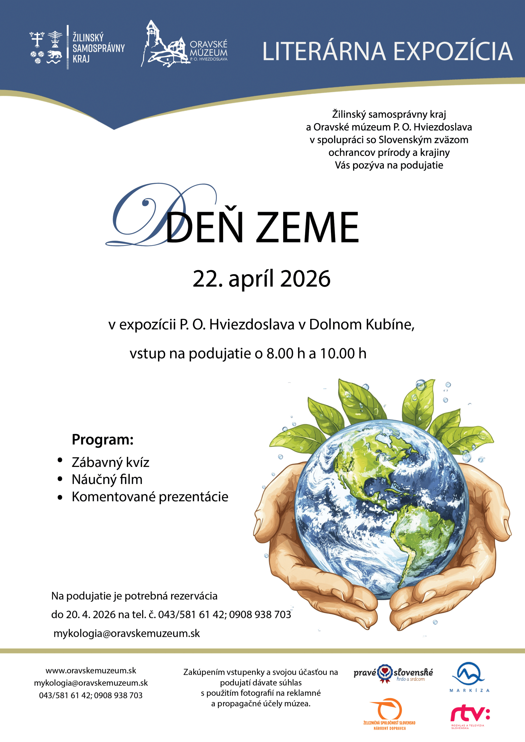 Oravské múzeum P. O. Hviezdoslava v spolupráci so Slovenským zväzom ochrancov prírody pripravilo na stredu 22. apríla 2026 v Expozícii P. O. Hviezdoslava v Dolnom Kubíne podujatie s názvom ,, Deň Zeme“. Program je vhodný pre žiakov II. stupňa základných škôl a stredných škôl. Žiaci sa môžu tešiť na filmy o prírodnom prostredí Oravy, komentované prezentácie a zábavný kvíz.