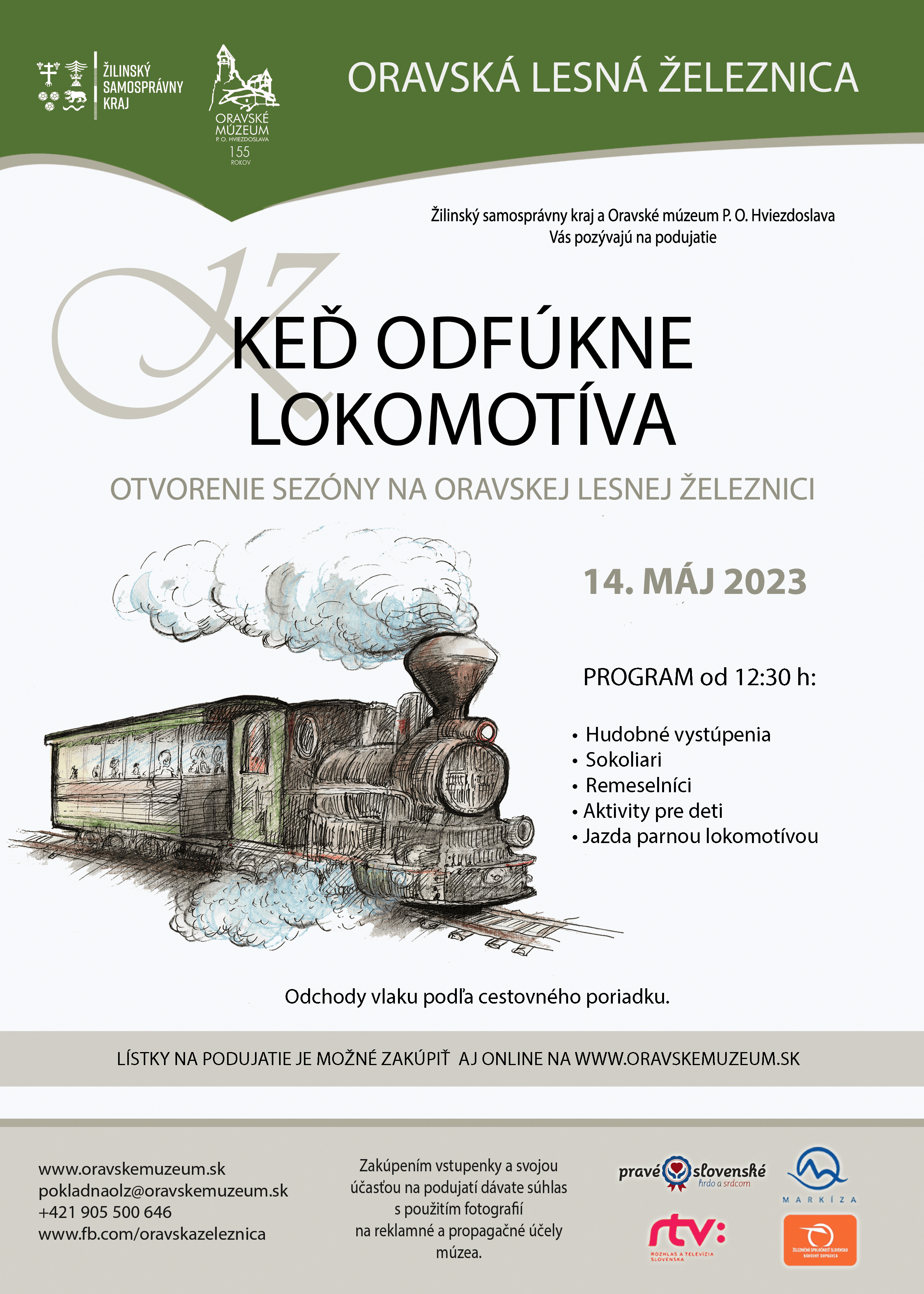 14. 5. 2023 otvoríme letnú turistickú sezónu aj v našej druhej najnavštevovanejšej expozícii Oravskej lesnej železnici v Oravskej Lesnej podujatím Keď odfúkne lokomotíva. Návštevníci železničky sa môžu tešiť na nezabudnuteľnú jazdu historickou parnou lokomotívou – Gontkulákom, vychutnať si atmosféru okolitej prírody a pozrieť si bohatý sprievodný program, ktorý bude prebiehať v areáli stanice Tanečník a pred expozíciou „Gorali včera a dnes“ na sedle Beskyd. Nebudú chýbať aktivity pre najmenších návštevníkov a ukážky z tvorby remeselníkov. Lístky na podujatie je možné zakúpiť aj ONLINE na www.oravskemuzeum.sk.