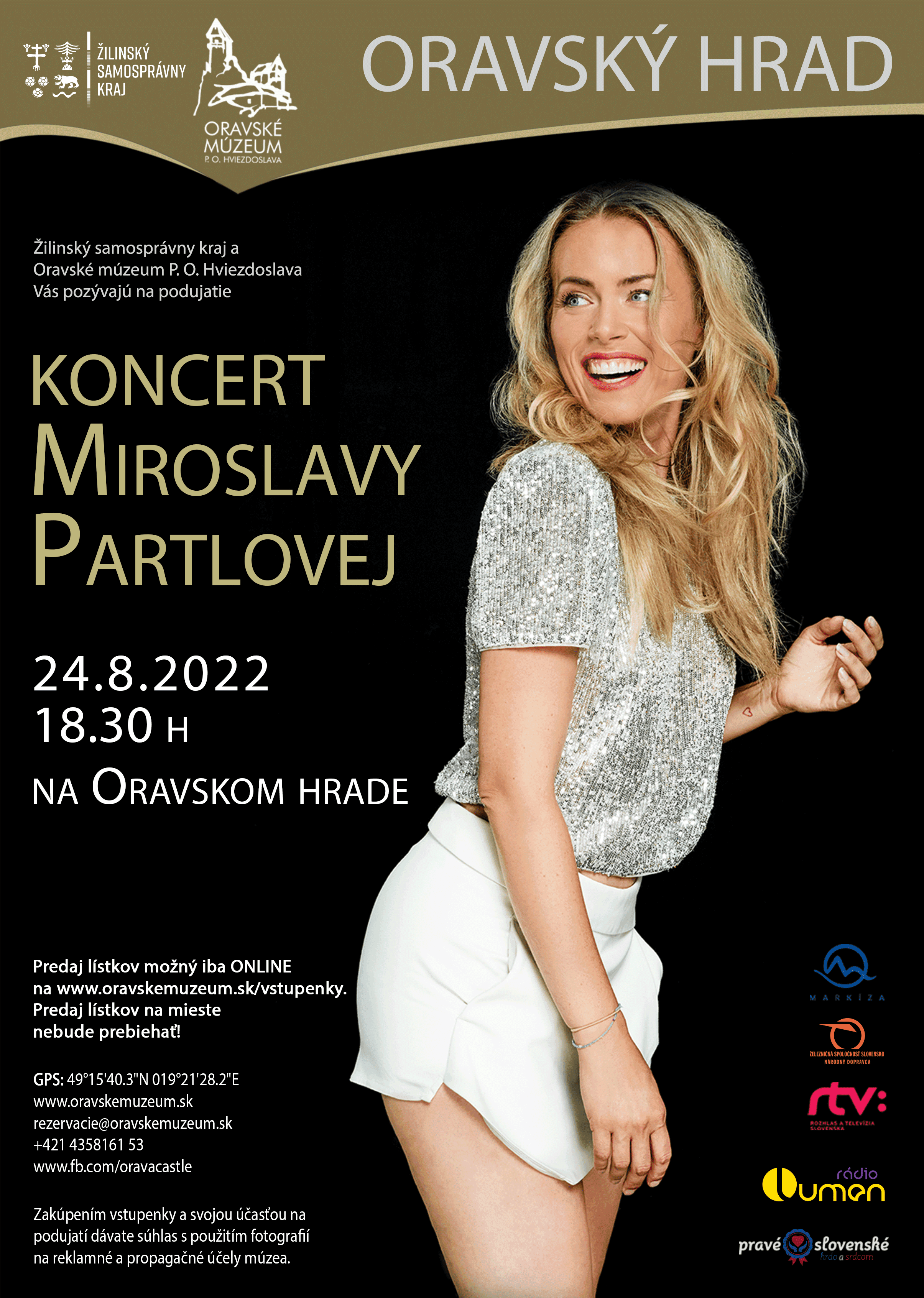 Dňa 24.8.2022 o 18.30 hod. vás pozývame na koncert Mirky Partlovej, ktorý sa uskutoční na hlavnom nádvorí Oravského hradu. Nenechajte si ujsť hudobné vystúpenie muzikálovej herečky a speváčky Mirky Partlovej v sprievode kapely. Tešiť sa môžete na známe melódie z muzikálu Dracula, ale aj inú populárnu hudobnú tvorbu. Vstupenky na koncert si môžete zakúpiť online tu: https://vstupenky.oravskemuzeum.sk/event/537234/koncert-mirky-partlovej, alebo priamo na mieste v pokladni pod Oravským hradom. Cena lístka je: 13€.
