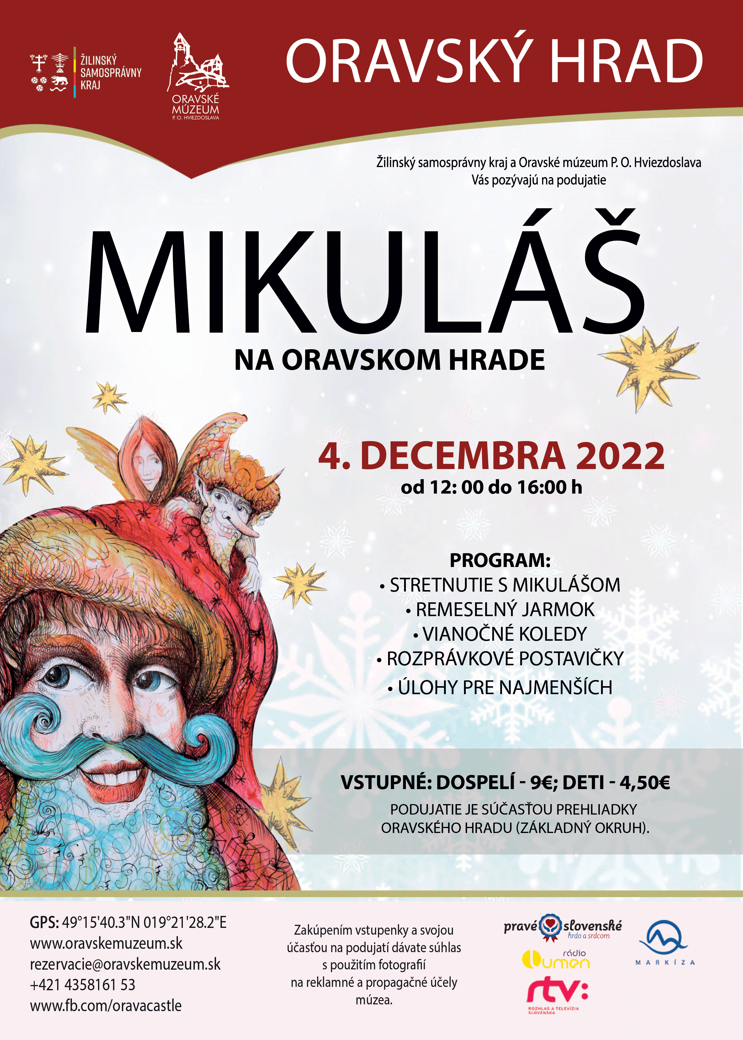 Pozývame všetkých, malých aj veľkých na Oravský hrad, kde 4. decembra 2022 zavíta Mikuláš. Návštevníci sa môžu tešiť na čarovnú predvianočnú atmosféru, ukážky pečenia voňavých oblátok, zdobenia medovníkov, remeselný jarmok, sladkú medovinu a nebudú chýbať i tradičné ľudové koledy. Deti sa stretnú s rozprávkovými kamarátmi, anjelikmi a čertíkmi, ktorí ich zapoja do zábavných úloh. Za ich splnenie ich Mikuláš obdaruje sladkým prekvapením. Podujatie je súčasťou prehliadky Oravského hradu (Základný okruh) od 12:00 do 16:00 h.