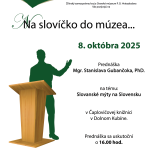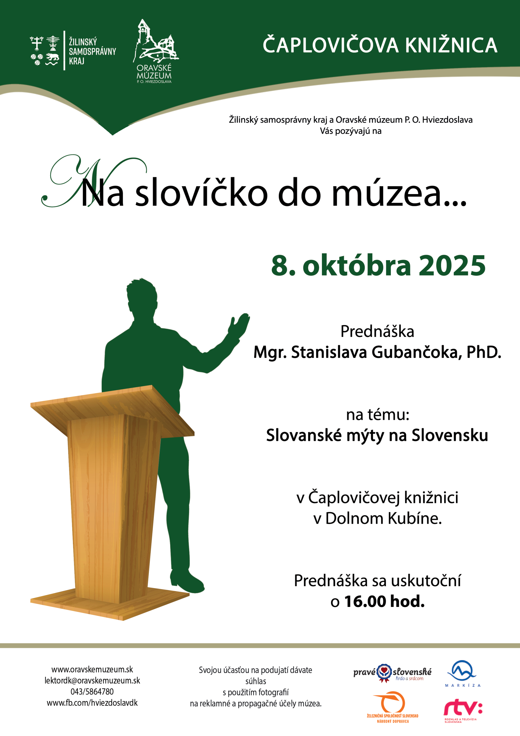 Oravské múzeum P. O. Hviezdoslava, ktorého zriaďovateľom je Žilinský samosprávny kraj, Vás dňa 8. októbra 2025 srdečne pozýva na ďalšiu prednášku nového prednáškového cyklu s názvom „Na slovíčko do múzea“. Piatym vzácnym hosťom, ktorý prijal naše pozvanie, je Mgr. Stanislav Gubančok, PhD., ktorý si pre Vás pripravil prednášku s názvom „Slovanské mýty na Slovensku“.