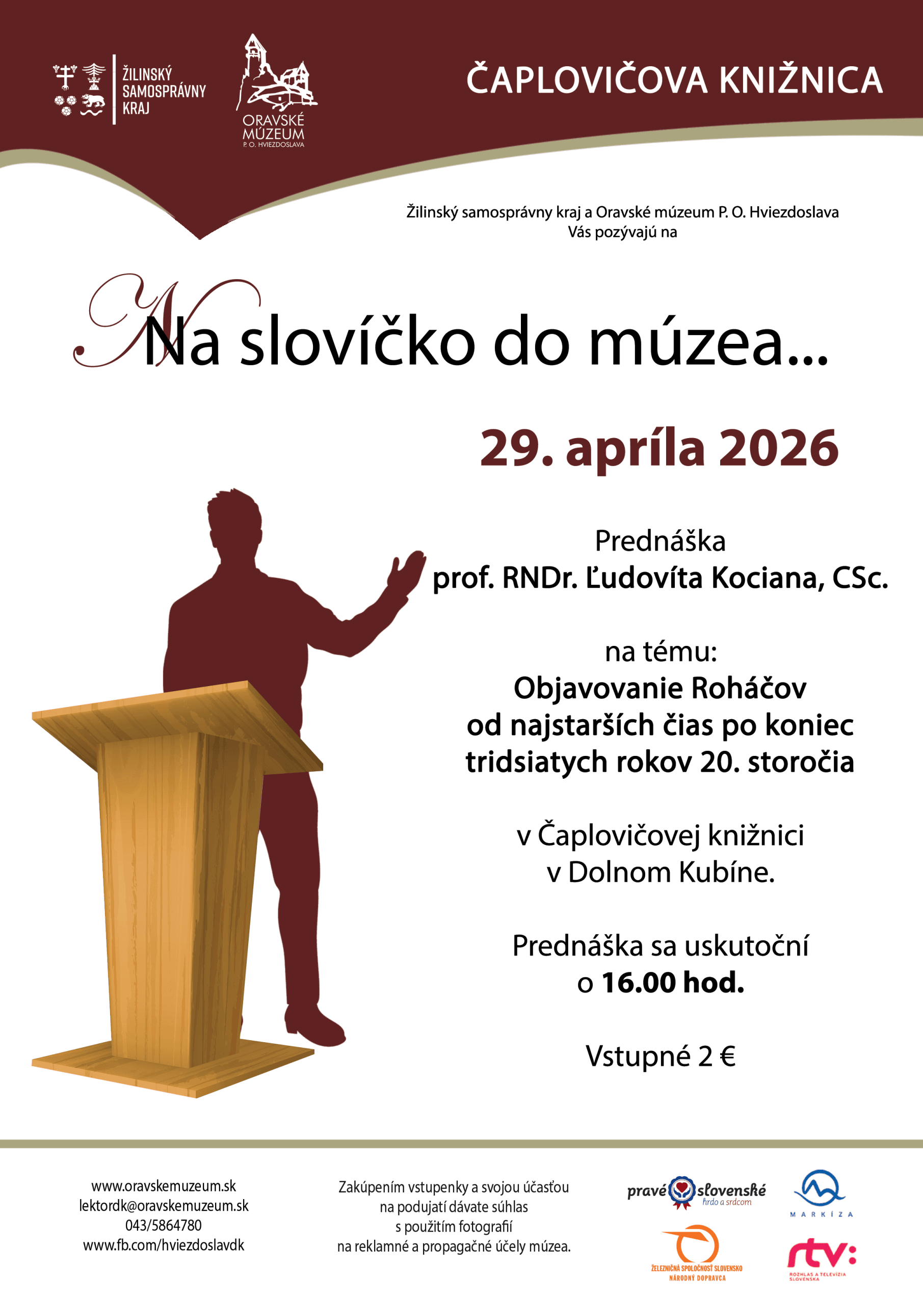 Oravské múzeum P. O. Hviezdoslava, ktorého zriaďovateľom je Žilinský samosprávny kraj, Vás dňa 29. apríla 2026 srdečne pozýva na druhý ročník prednáškového cyklu „Na slovíčko do múzea“. Tohtoročným prvým hosťom, ktorý prijal naše pozvanie, je prof. RNDr. Ľudovít Kocian, CSc., ktorý si pre Vás pripravil prednášku s názvom „Objavovanie Roháčov od najstarších čias po koniec tridsiatych rokov 20. storočia“.