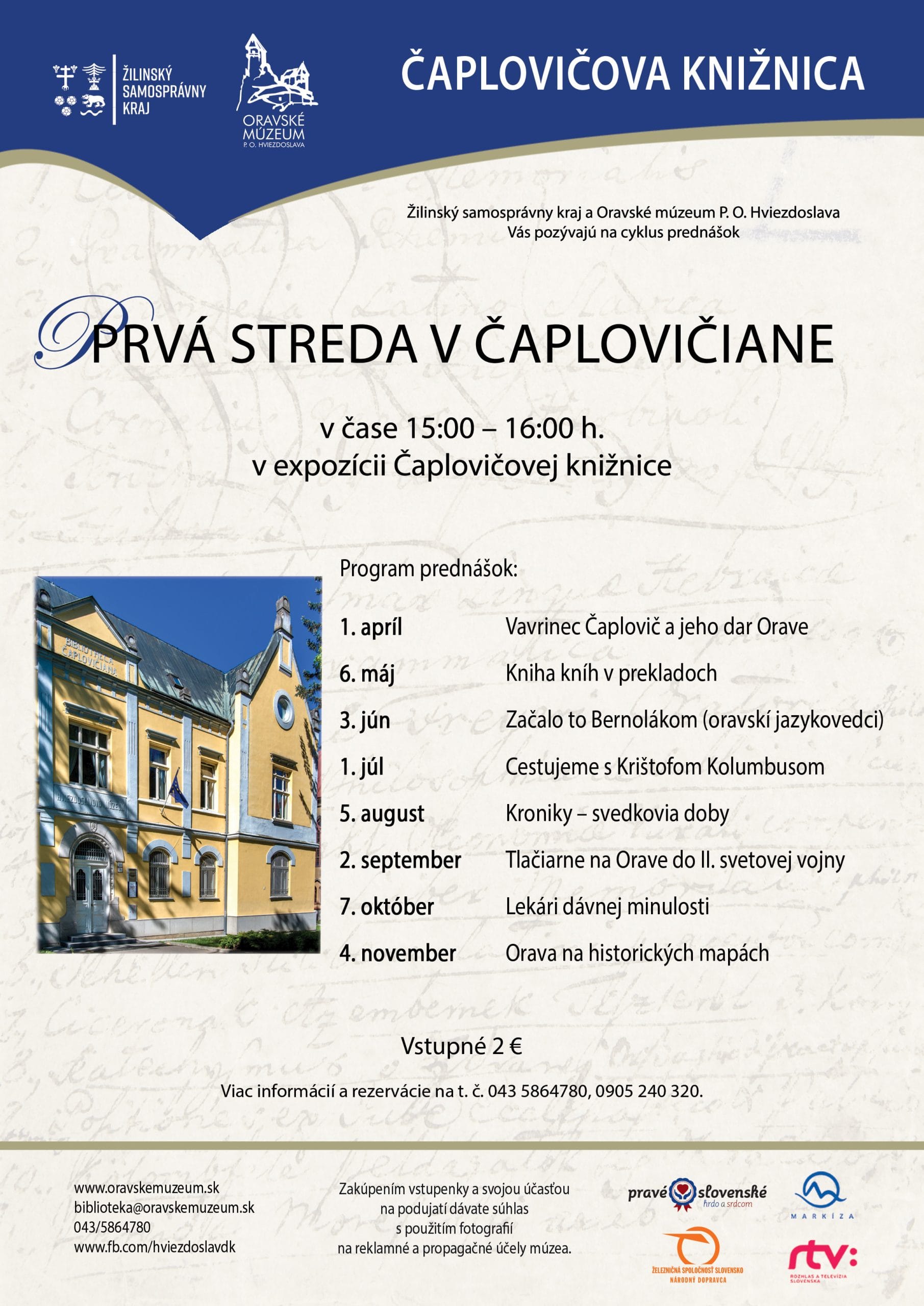 Neváhajte preto prijať naše pozvanie každú prvú stredu v mesiaci a príďte do Čaplovičovej knižnice. Začíname už 1. apríla 2026 o 15:00 hod. Pilotný projekt cyklu tematických prednášok s ukážkami z historického fondu knižnice je určený širokej verejnosti. Jednotlivé témy predstavia knihovníčky Čaplovičiany.