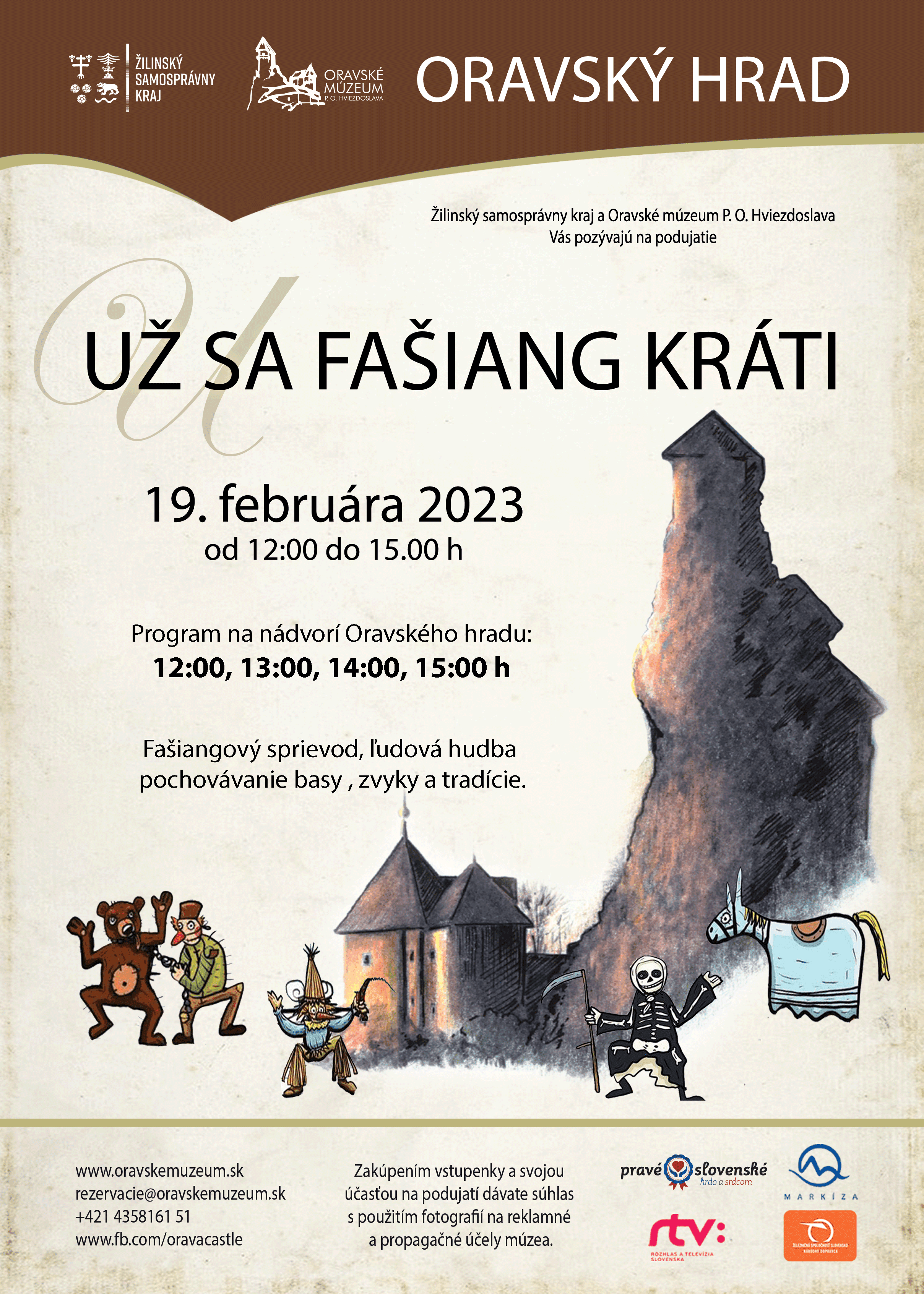 Oravské múzeum P. O. Hviezdoslava pripravilo pre návštevníkov Oravského hradu počas jarných prázdnin podujatie „Už sa fašiang kráti“, ktoré sa bude konať v nedeľu 19. 2. 2023 na hlavnom nádvorí. Fašiangové obyčaje a zvyky sú súčasťou tradičnej kultúry regiónu Orava a pretrvali v rôznych podobách až do súčasnosti. Návštevníci sa môžu tešiť na sprievod fašiangových masiek, prezentáciu zbierkového fondu Oravského múzea, ľudovú hudbu, tanec a zábavu, ktorú ukončí pochovávanie basy. Predaj lístkov na podujatie bude prebiehať na pokladni Oravského hradu.