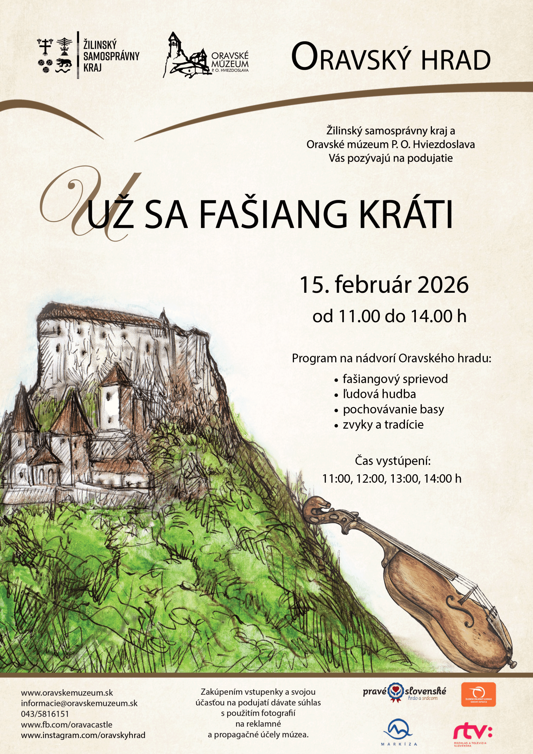 Oravské múzeum P. O. Hviezdoslava Vás 15. februára 2026 od 11.00 do 14.00 hod. srdečne pozýva na podujatie s názvom „Už sa fašiang kráti“, ktoré sa uskutoční na Hlavnom nádvorí Oravského hradu. Fašiangové masky, ľudová hudba, pochovávanie basy, staré zvyky a tradície. Príďte zažiť neopakovateľnú atmosféru Fašiangov na Oravský hrad. Obdobie Fašiangov je súčasťou tradičnej kultúry regiónu Orava už niekoľko desaťročí. Na Orave sa najintenzívnejšie oslavovali práve posledné tri dni (nedeľa, pondelok a utorok) pred „Škaredou stredou“. Koledníci v maskách medveďa, turoňa, smrtky a slameníka s radosťou navštevovali aj príbytky zemanov a neobišli ani hradné panstvo, ktoré sa pred obdobím prísneho pôstu tiež rado zabavilo.