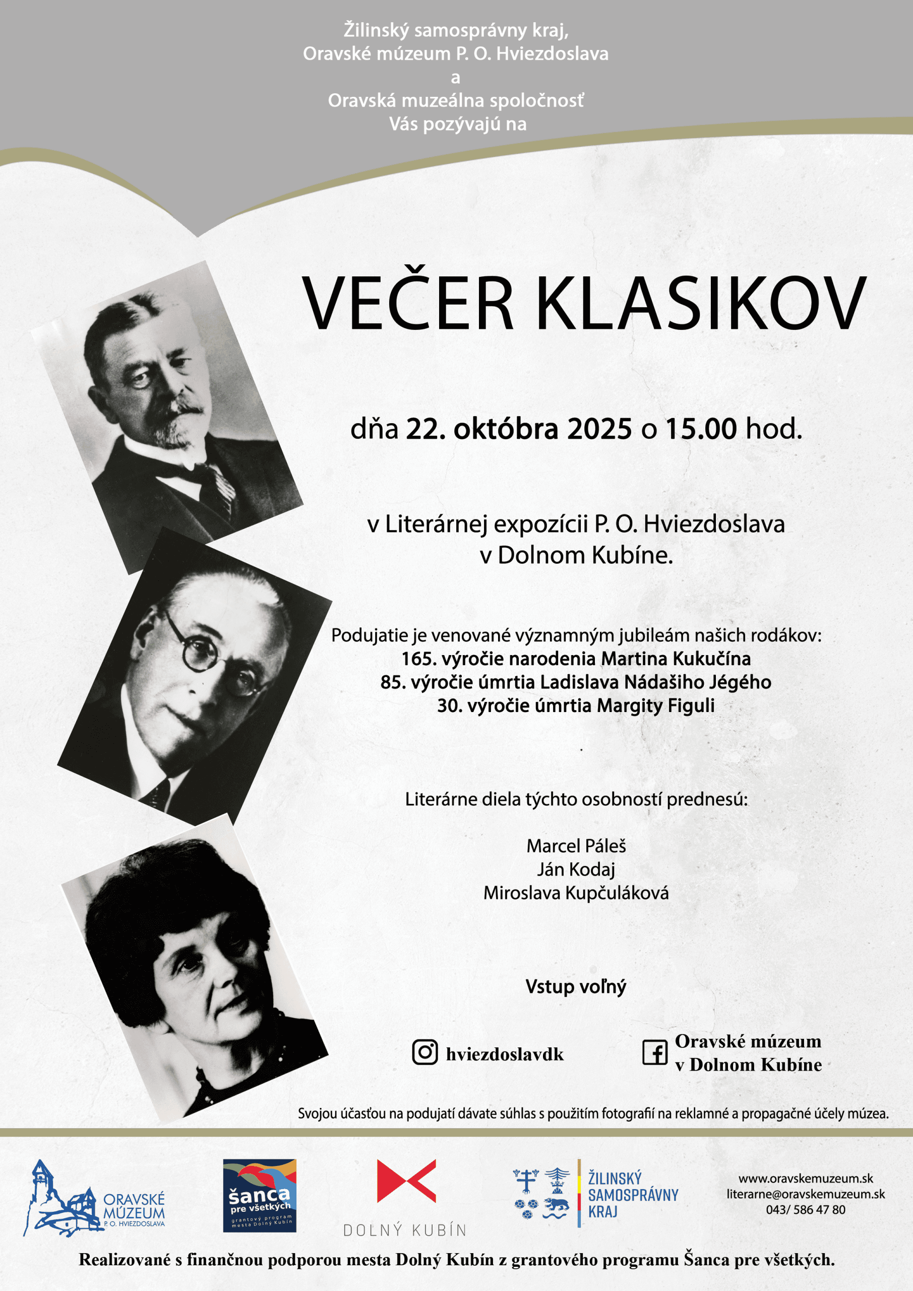 Žilinský samosprávny kraj, Oravské múzeum P. O. Hviezdoslava v Dolnom Kubíne a Oravská muzeálna spoločnosť pripravili v stredu 22. 10. 2025 o 15.00 hod. podujatie s názvom „Večer klasikov“. Podujatie sa uskutoční v Literárnej expozícii P. O. Hviezdoslava, v budove Čaplovičovej knižnice v Dolnom Kubíne.
