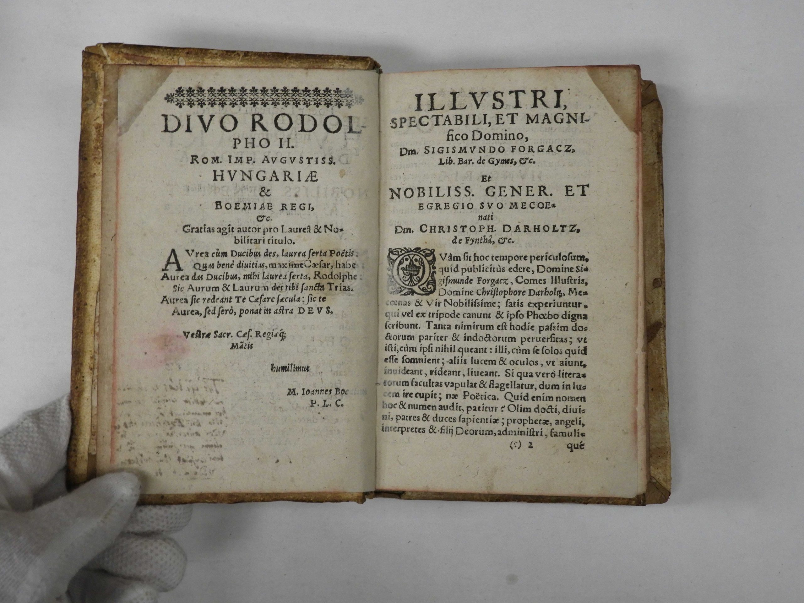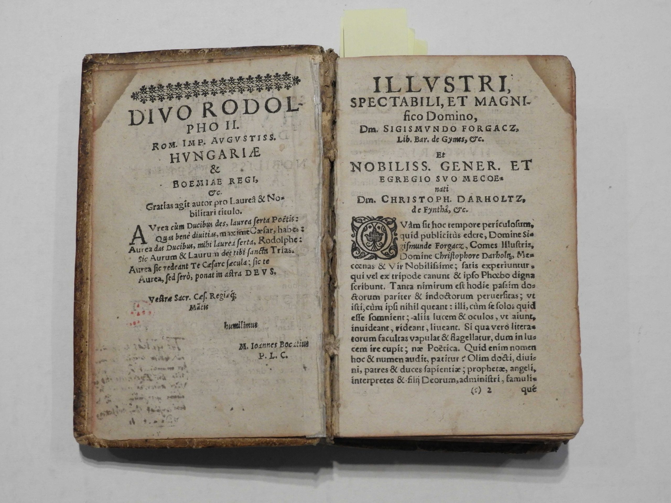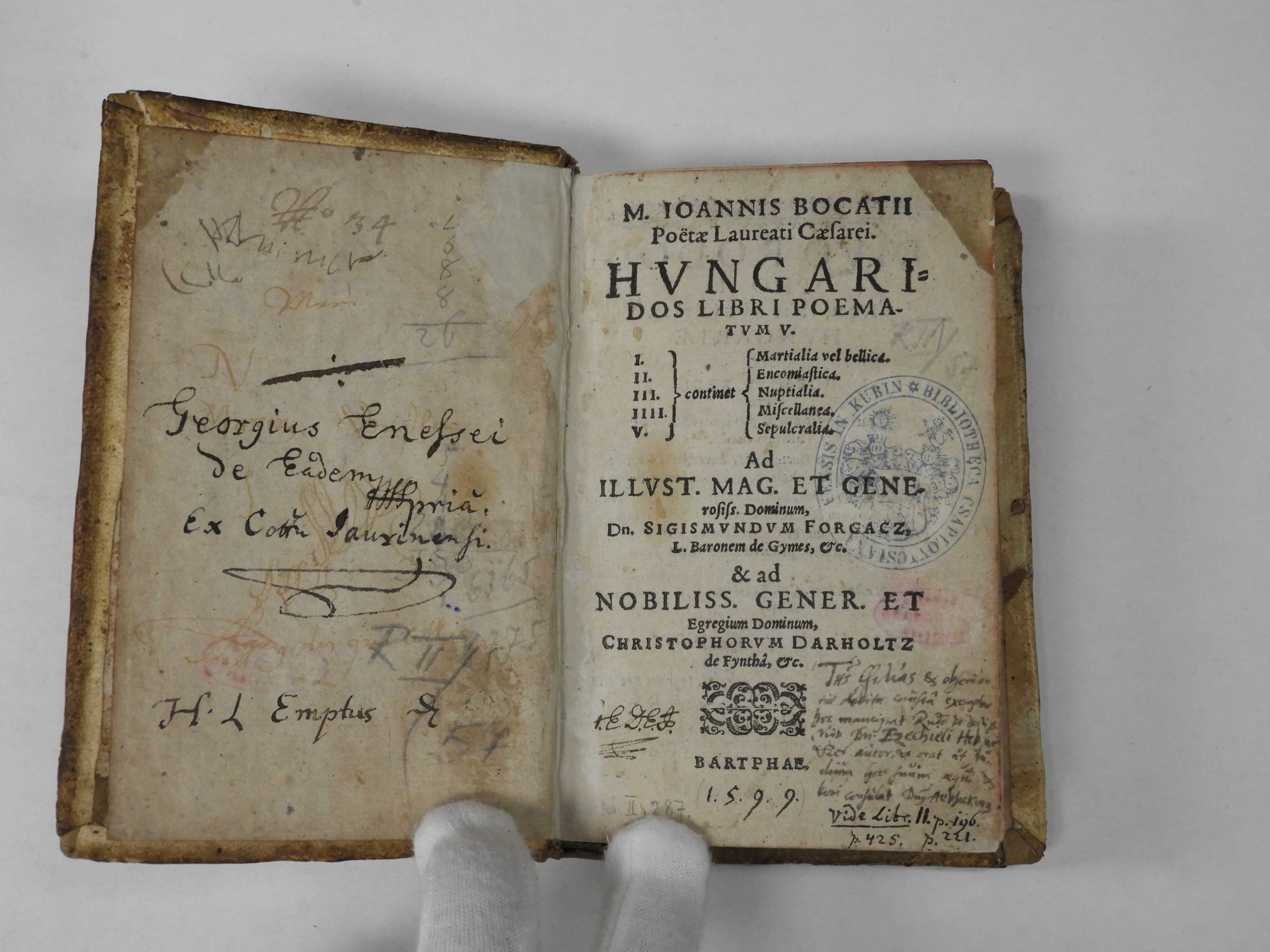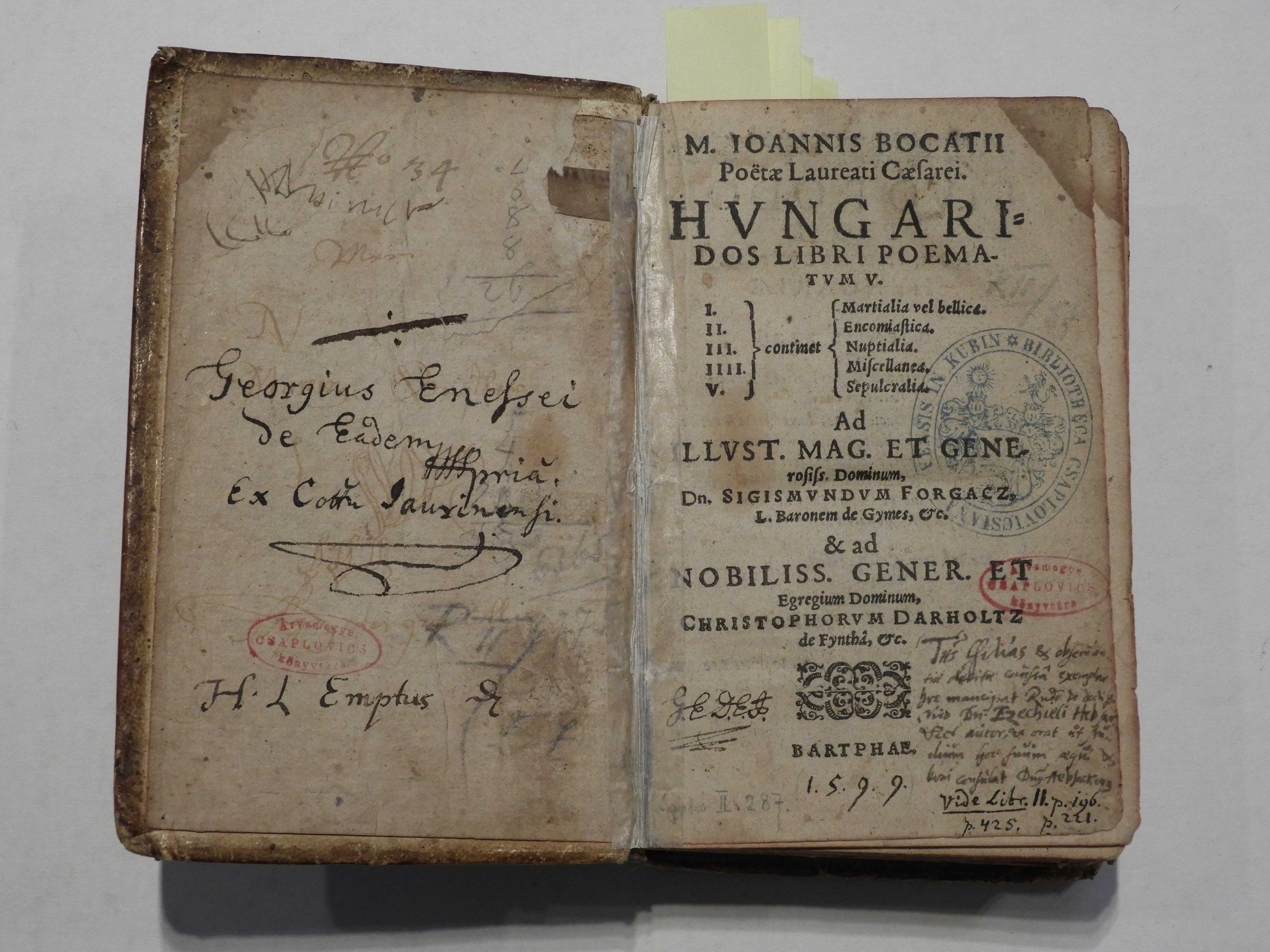 Cieľom projektu bolo zreštaurovanie dvoch vzácnych tlačí: autorom prvej z nich je známy literát, pedagóg, historik a diplomat Ján Bocatius. Jeho dielo s názvom Hungaridos Libri Poematum V. v preklade Päť kníh uhorských básní napísal v roku 1599 a bolo vydané v tlačiarni Jacoba Klössa v Bardejove. Bocatius uplatnil svoj básnický talent v tejto zbierke, ktorá je tematicky rozdelená na päť častí. V prvej dominujú básne s vojenskou tematikou, má názov Martove alebo vojenské básne. V ďalších častiach sú typické básne príležitostnej poézie ale tiež osobná, subjektívna lyrika – Oslavné básne, Svadobné básne, Rozličné básne a Pohrebné básne. V jeho tvorbe je bohato zastúpený žáner epigramov, najmä satirické epigramy proti opilstvu, proti osobným nepriateľom alebo zlým ľudským vlastnostiam. Vzorom pre tvorbu v tomto žánri mu boli zrejme epigramy rímskeho básnika Martiala.