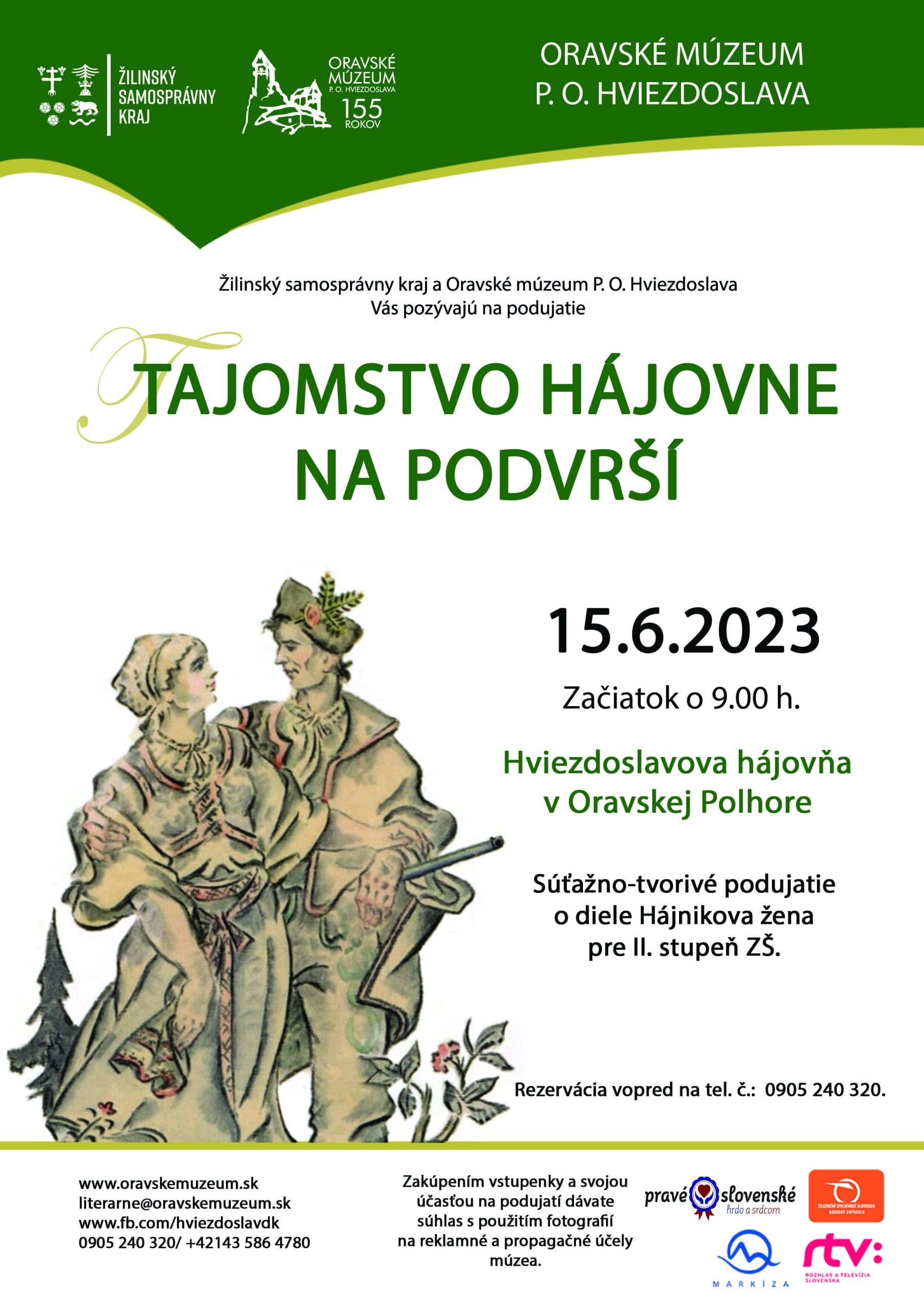 Oravská Polhora, 16. jún 2023 – Oravské múzeum P. O. Hviezdoslava, ktorého zriaďovateľom je Žilinský samosprávny kraj, pripravilo podujatie s názvom „Tajomstvo hájovne na Podvrší“. Podujatie prebiehalo v areáli Hviezdoslavovej hájovne 15. júna 2023 od 9.00 hod. Program bol určený pre žiakov II. stupňa základných škôl. Podujatia sa zúčastnilo okolo 80 žiakov zo ZŠ s MŠ Rabčice a ZŠ s MŠ Oravská Polhora. Žiaci sa pred vstupom do areálu rozdelili na menšie skupiny, dostali do rúk brožúry a základné pokyny k priebehu podujatia. Brožúry obsahovali text, v ktorom chýbali kľúčové heslá. V areáli Hájovne sa nachádzali tri stanovištia a na každom dostali žiaci tri úlohy, ktoré preverili ich zručnosti, pozornosť i pamäť. Po zvládnutí všetkých úloh a správneho doplnenia hesiel do textu získali víťazi odmenu.