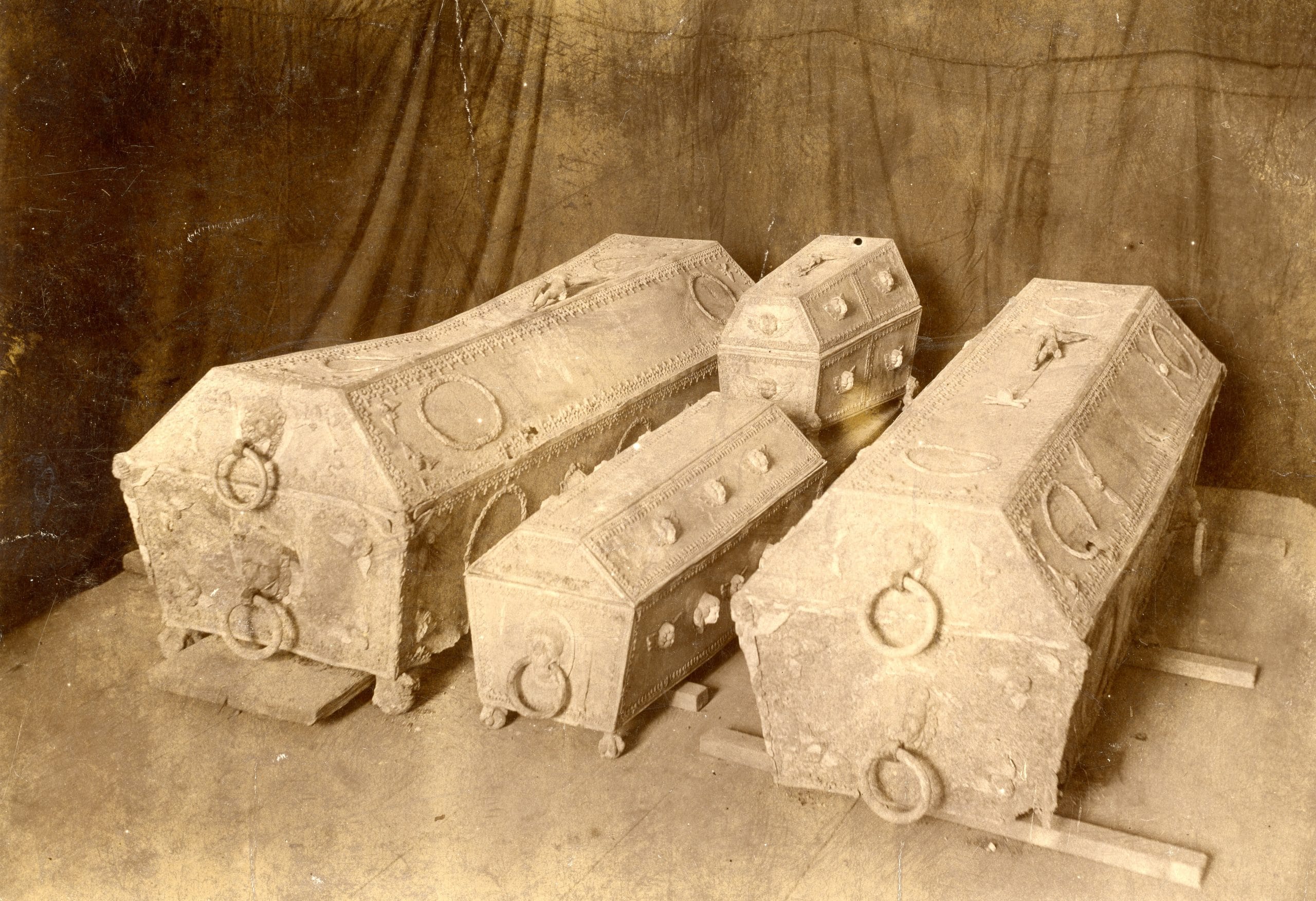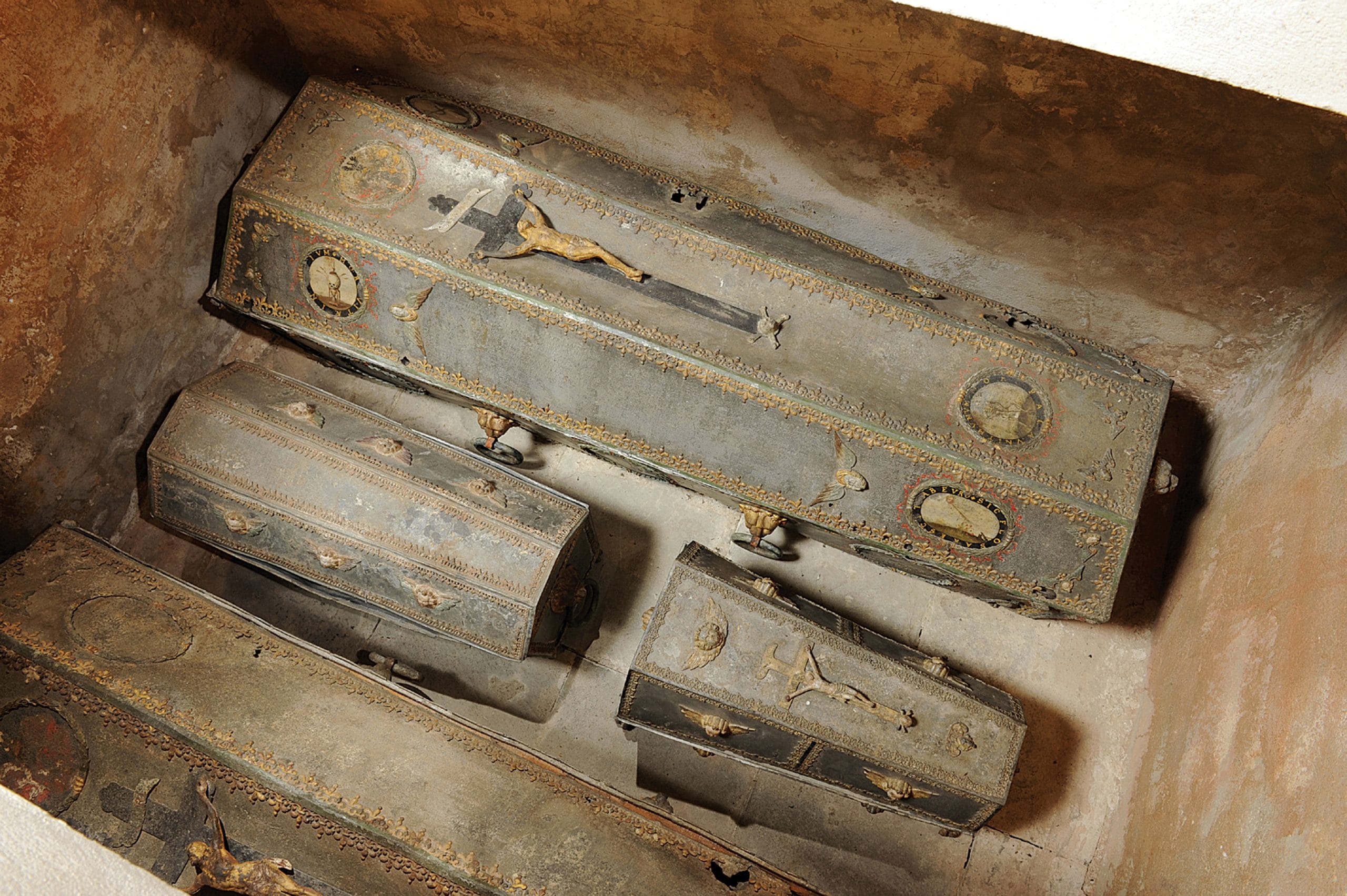 V krypte sú uložené spolu štyri kovové truhly, dve veľké a dve malé, a to tak, že dve väčšie truhly bok po boku zakrývajú dno krypty a dve menšie sú umiestnené na tých väčších. Stopy po tom, že truhly boli otvárané, sú viditeľné len na jednej menšej rakve. Jej vrchnák je na jednom rohu oddelený od spodnej časti a vidno malú medzeru, ktorá nevznikla sama od seba. O čo sa skutočne ide, sme ponechali na neskoršie pátranie.