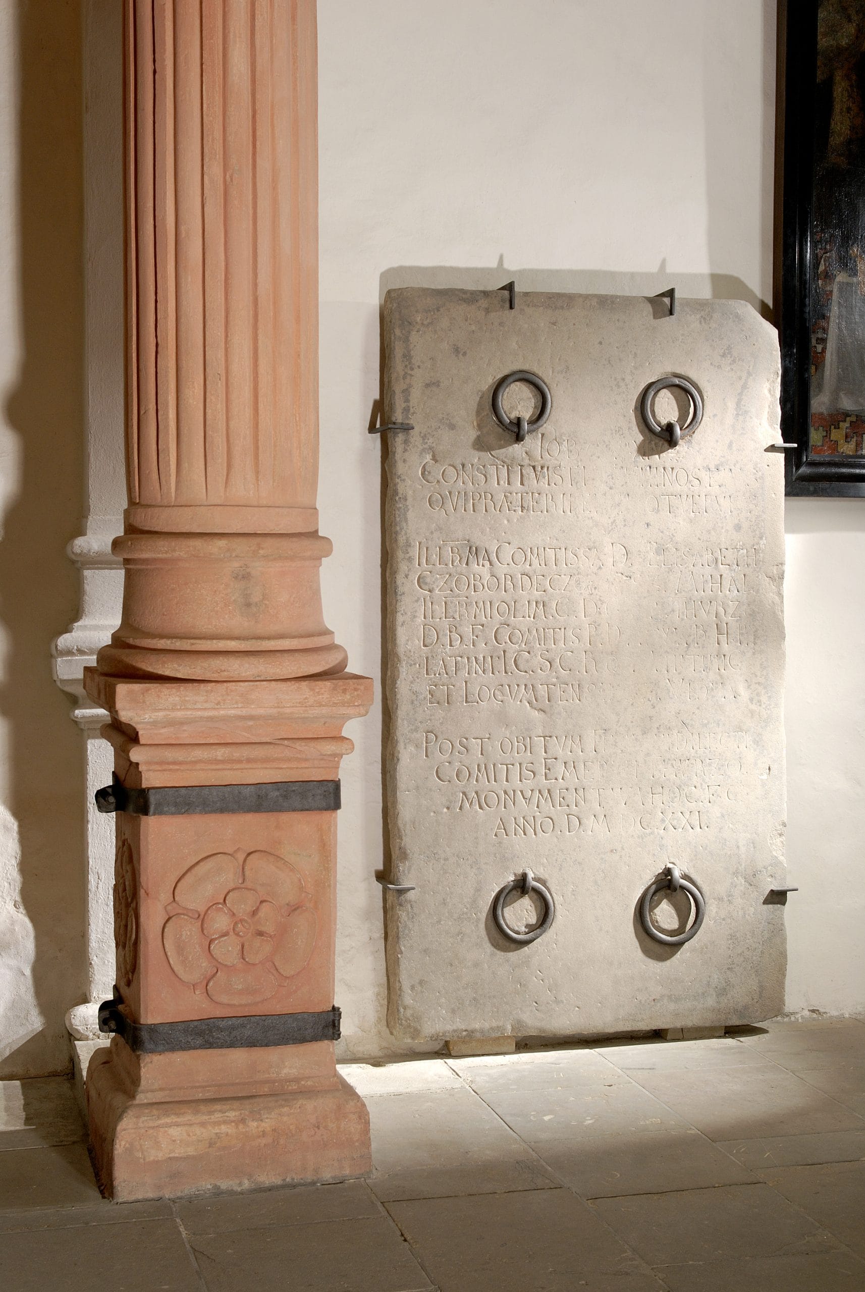 Najvznešenejšia grófka, pani Alžbeta, dcéra urodzeného pána Michala Czobora, vdova po najvznešenejšom zosnulom pánovi grófovi, pánovi Jurajovi Thurzo, bývalom palatínovi uhorského a kráľovskom miestodržiteľovi, po smrti svojho milovaného syna, grófa Imricha Thurzo, nechala osadiť túto hrobku monumentálnym vekom roku Pána 1621.[6]