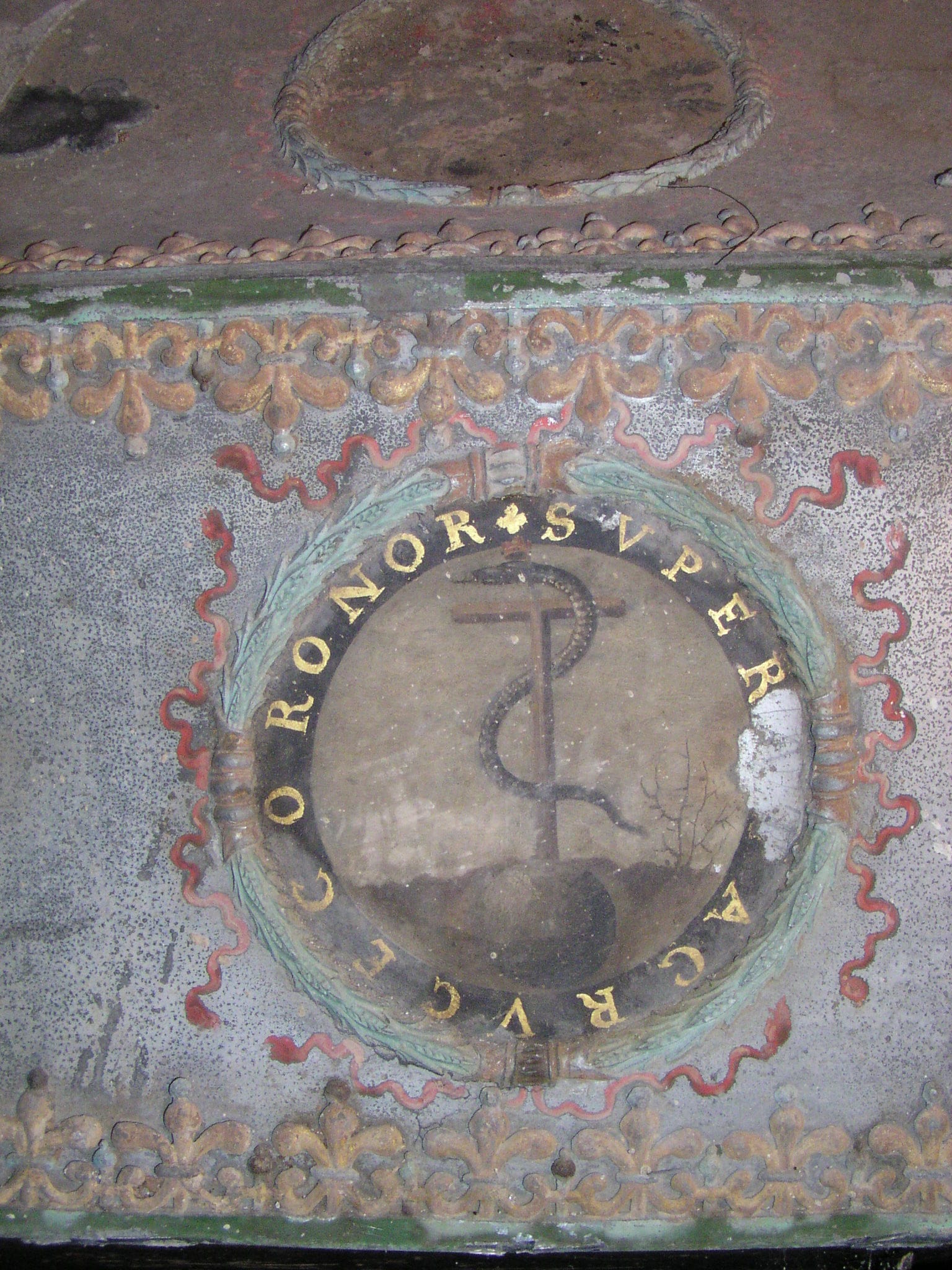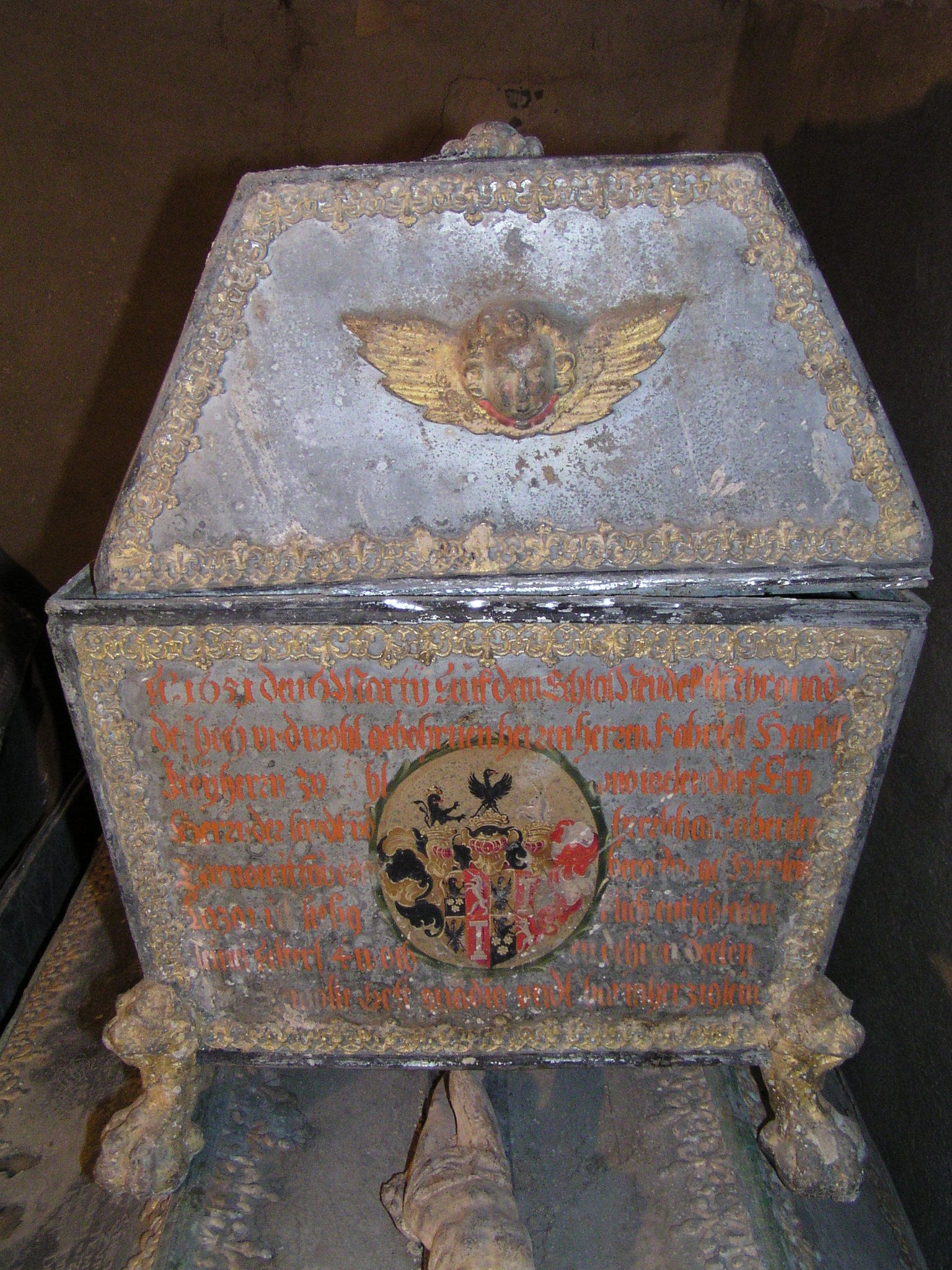 Všetky truhly, nakoľko to bolo možné pri slabom svetle konštatovať, sú kovové, ozdobené pozláteným ozdobným kovaním, maľovanými medailónmi hlávkami anjelov a vidno aj erby, ako možno súdiť podľa jedného, ktorý je namaľovaný na jednej z menších truhiel. Okrem toho sú rakvy zdobené ešte stále čitateľnými nápismi. Z týchto jeden, nachádzajúci sa na jednej strane vrchnáka veľkej truhly, ktorá sa nachádza naľavo od vstupného otvoru a je vyrytý do kovu, znie takto: „Tu leží Onen šľachetný a urodzený pán, pán Gabriel, gróf Henkel, slobodný pán z Donnersmarku, pán Gfellu a Vesendorfu. Dedičný pán krajiny a panstva v Beutene, Tarnovitzi a Oderburgu. On si vzal za manželku šľachetnú a urodzenú pani, pani Sidóniu, slečnu Sunyoghovú z Jesenice v roku 1645. 20 rokov s ňou žil v stave manželskom, splodil s ňou deti, a to ich syna Lazara, ktorý sa narodil 6. marca roku Pána 1651, ktorý však dosiahol len vek 4 týždne a štyri slečny, Annu Sidóniu, Máriu, Jakobínu a Eleonóru, ktoré ešte žijú a už zosnulú Emerenciu, ktorá sa narodila 1. júna roku 1653 a zomrela 4. februára 1654.  Tento bohabojný pán gróf sa narodil v roku Pána 1610, zomrel v roku 1666, 14. dňa jesenného mesiaca (septembra?) vo veku 56 rokov.“[9]